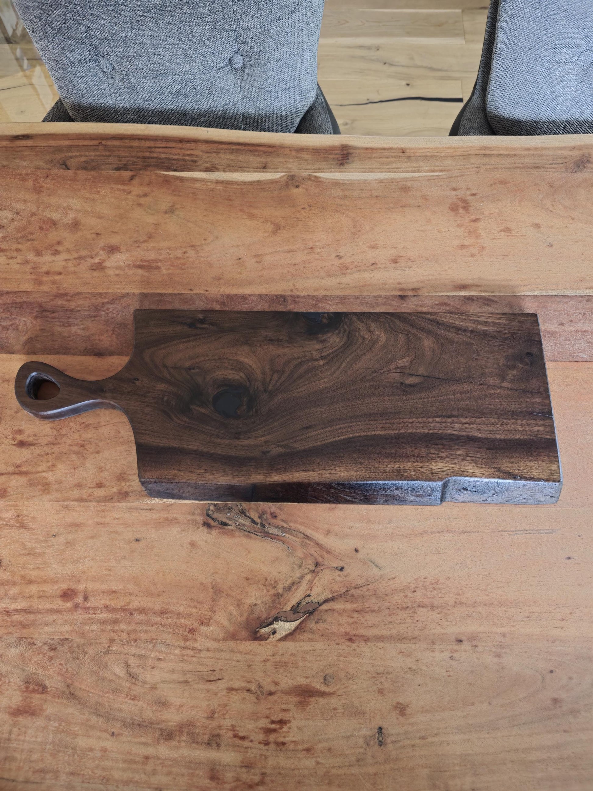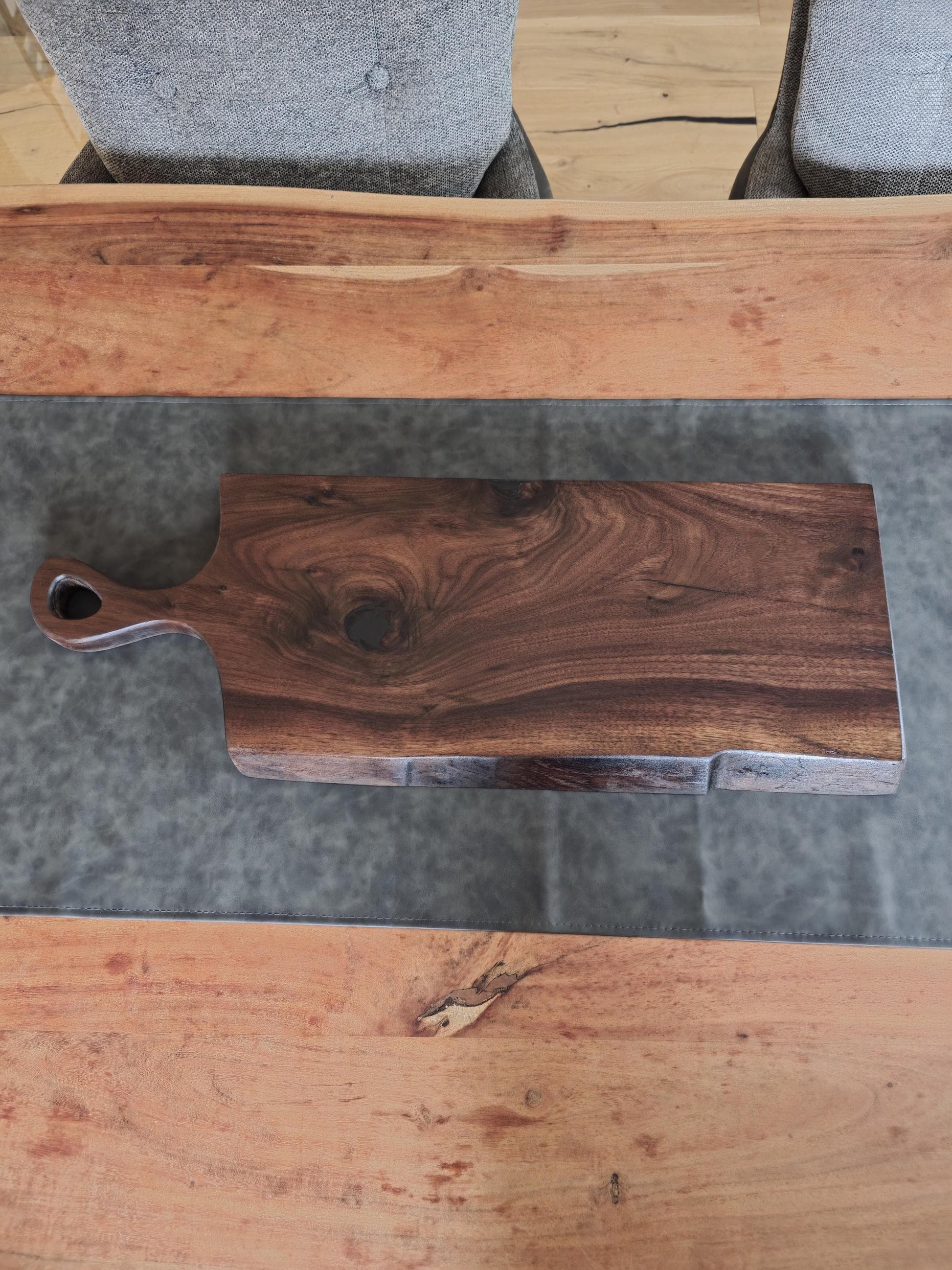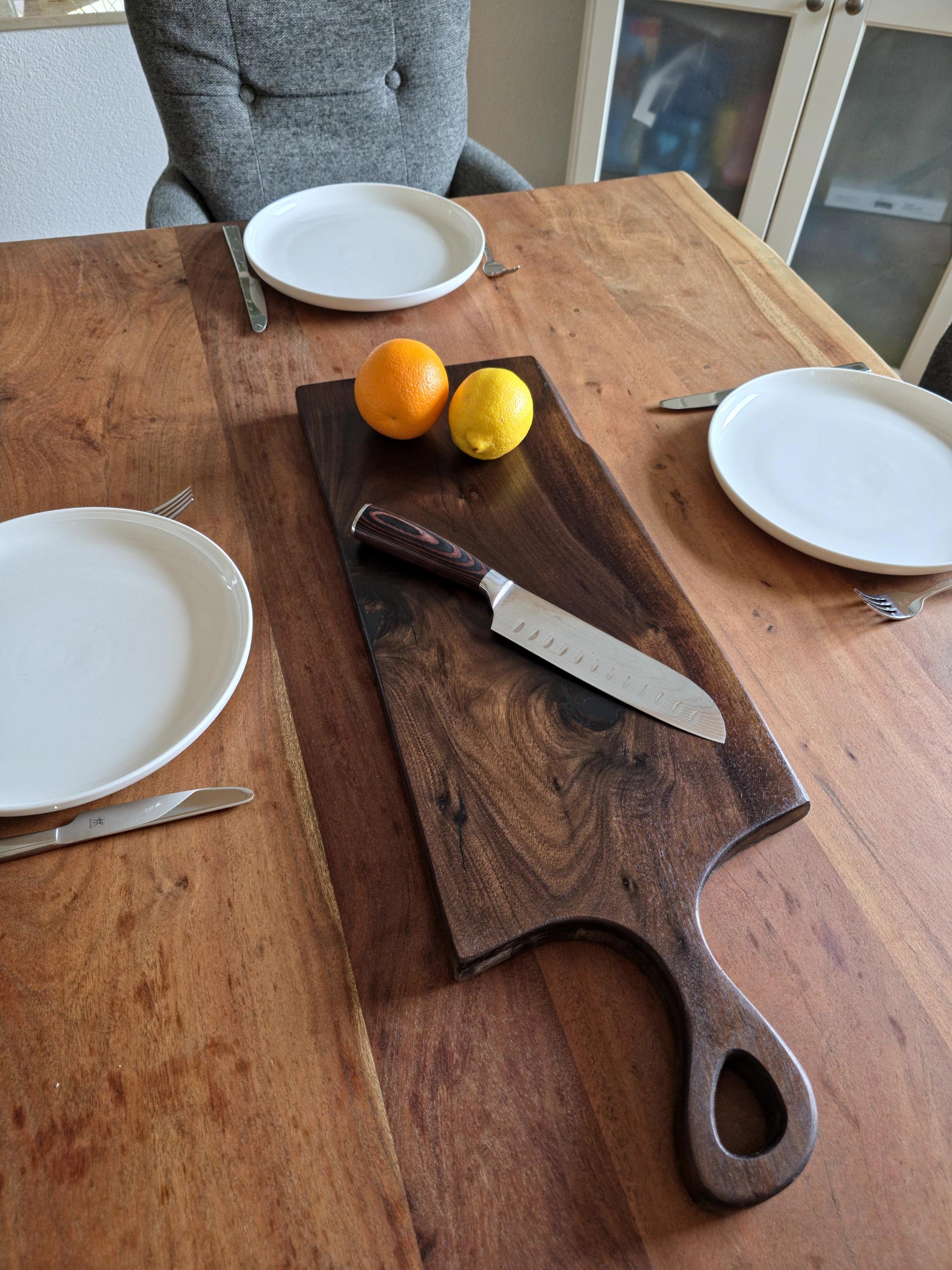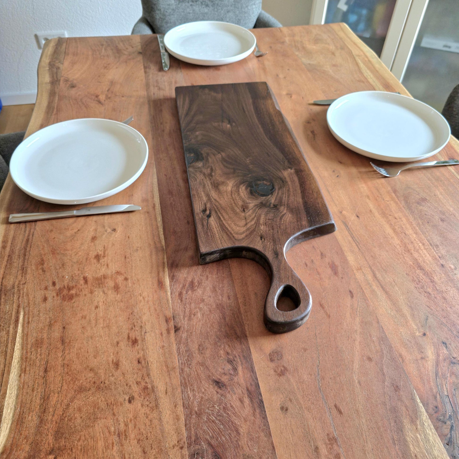 Dieses elegante Schneide- und Servierbrett aus amerikanischem Walnuss ist ein echtes Highlight in jeder Küche. Die warme, dunkle Maserung und die organische Form mit Griff machen dieses Stück zu einem einzigartigen Unikat.